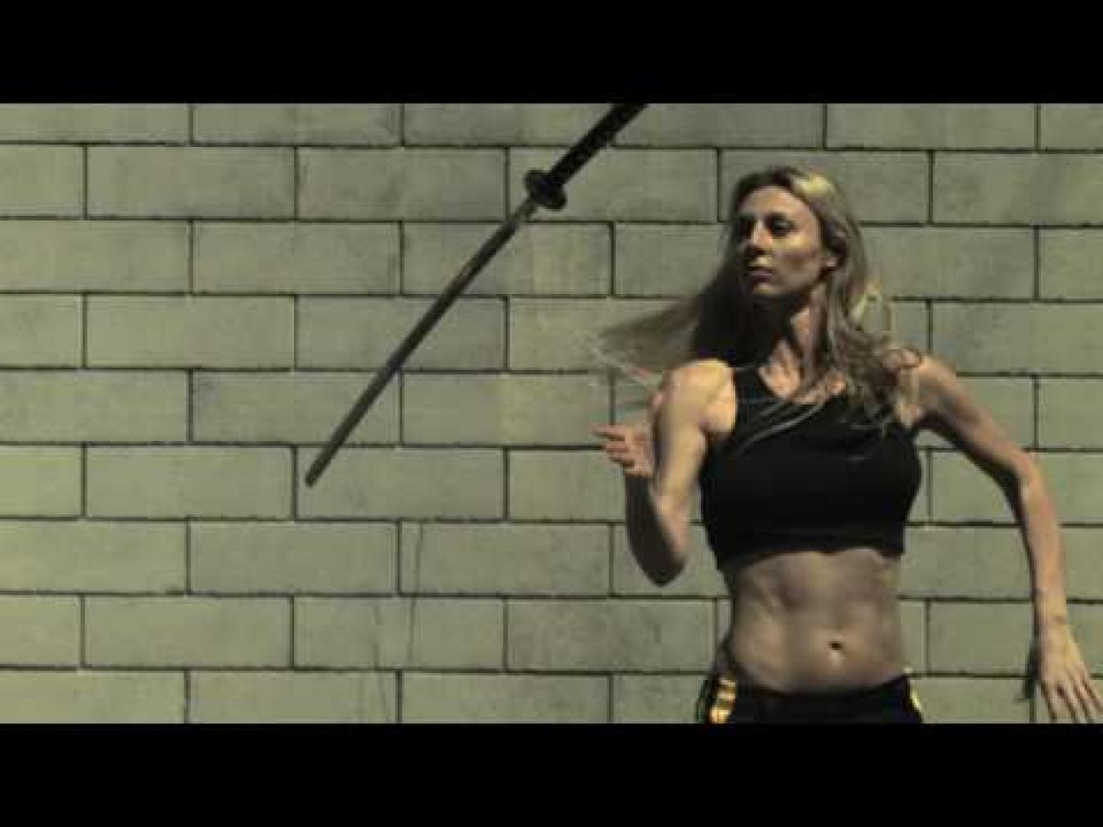Nubile Bulgarian gymnast juggling with sword. Watch the video at the link.