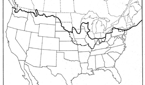 Solid line is the approximate extent of glaciation in the last Ice Age, 11,000 years ago. All ice above it. People below it could survive. Dotted line is the approximate extent in the previous Ice Age.