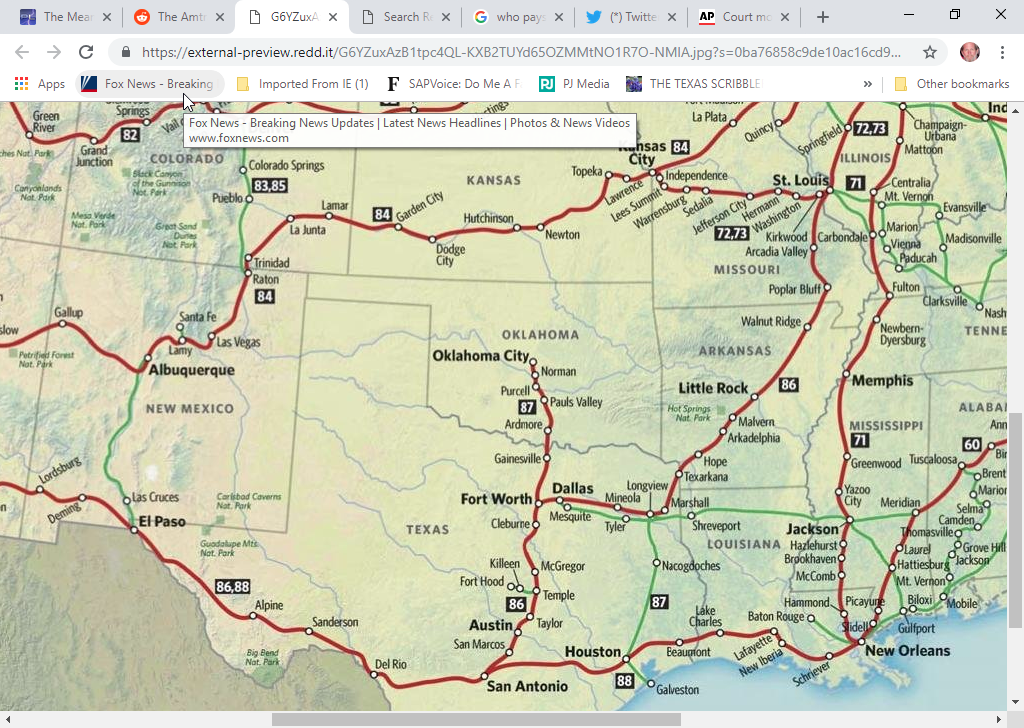 UPDATE: We’ve bought tickets do it all: go north, west, south, and east. From Austin to Austin. Over seven days. With overnights in Trinidad, Albuquerque and El Paso. Most of the way in private sleeper compartments called “bedrooms” with an enclosed toilet, sink and shower. And a big picture window. Starting Feb. 9. Have to book early to get the compartments which are in high demand and low supply on any given train. More as we get closer.