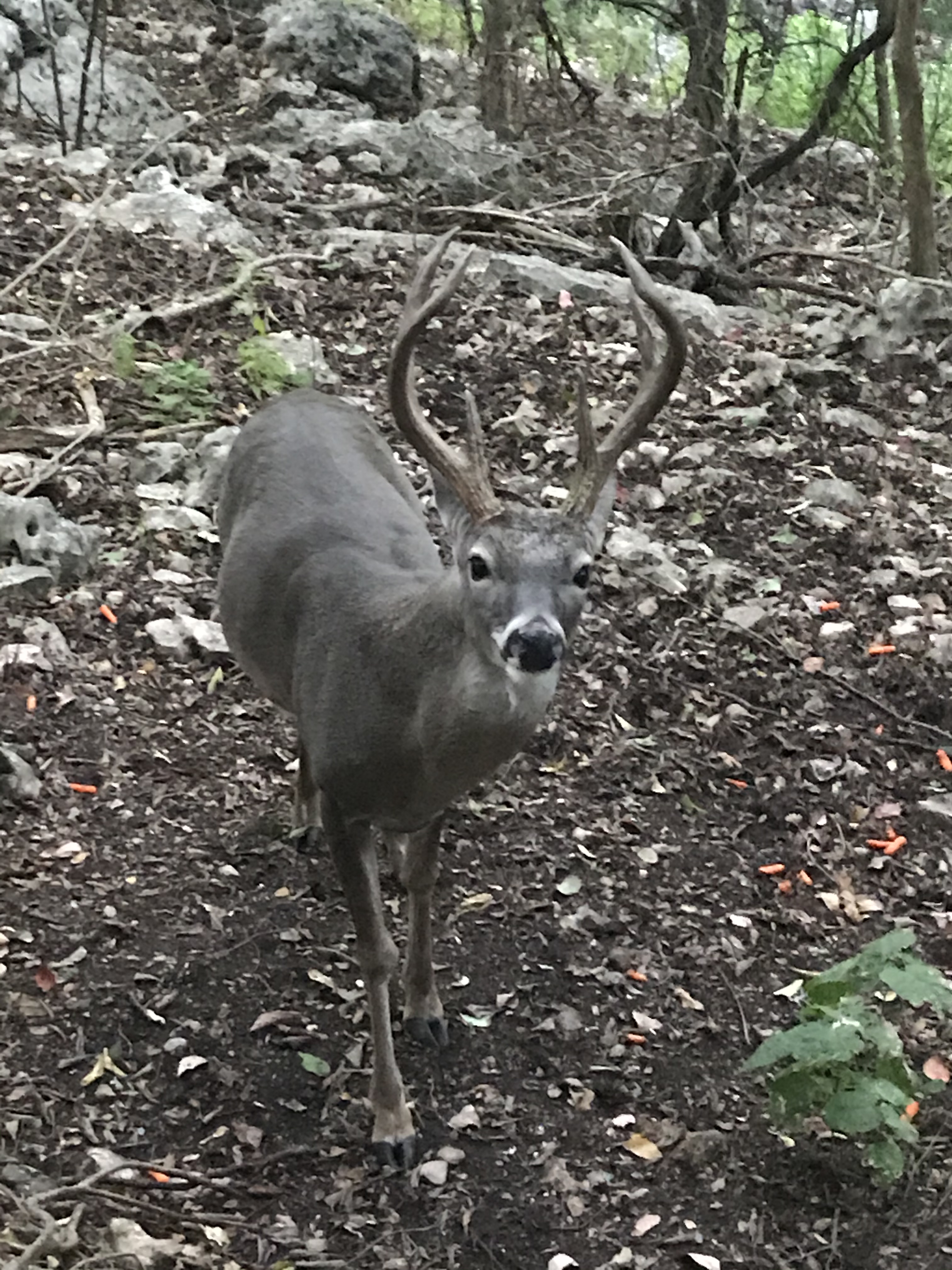 A stud muffin of Neely’s Canyon’s white-tailed deer, come to see about our feeding of carrots and peanuts to his herd. He grew the big, trophy horns thanks to the ‘no hunting’ law in the Austin city neighborhood which overlooks the city- and county-managed Balcones Canyonlands Preserve.