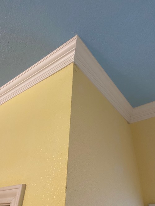 The promised pic of the new crown molding at the mini-rancho. That’s 4 and 1/2 inches x 3/4 inches in Mr. B.’s room, the only one so far with an outer corner to show off the molding joint. With blue ceiling and so-far un- repainted yellow walls.