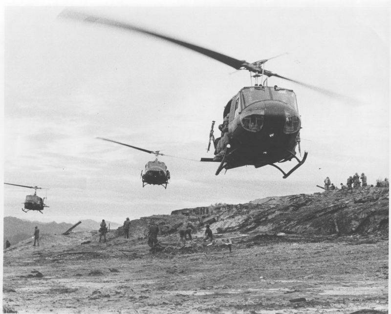 Note the M-60 machinegun tilted downward on the left side of the bird on the right. Nobody went unarmed. Even our Medevacs had door guns. Old times.