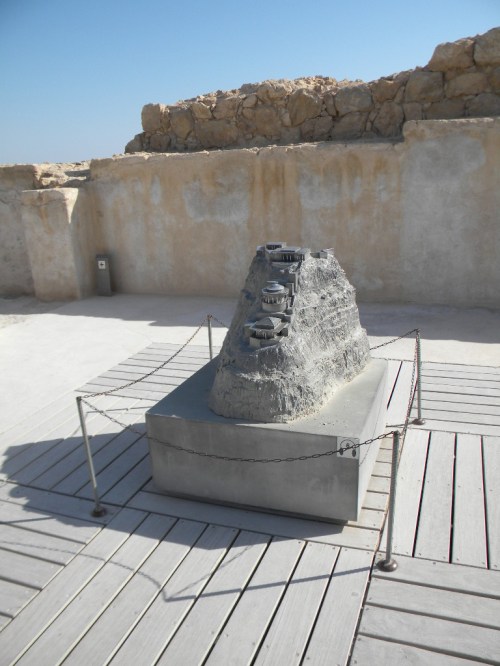 A model of the ancient Jewish fortress of Masada at, where else, Masada itself. Of course the model depicts Herod’s intact palaces at the mountain’s north end. They’re ruins today, and explained well here, and rather more completely in this good book bringing all of the archaeology up to date.