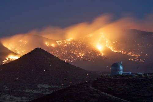 These Davis Mountains fires are out now but this is the way they looked at their worst last Sunday. That’s McDonald Observatory’s giant HET in the foreground. Photo by Frank Cianciolo of the observatory’s visitor center.