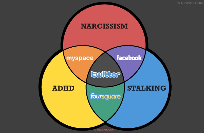 Tagged ADHD, demotivators, Despair, Facebook, Foursquare, Inc., MySpace, Narcissism, Stalking, Twitter